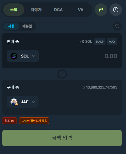 솔라나가 이동이 완료되면 아래와 같은 화면에서 원하는 솔라나의 수량 만큼 재코인(jaecoin)으로 스왑이 가능하게 됩니다.