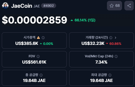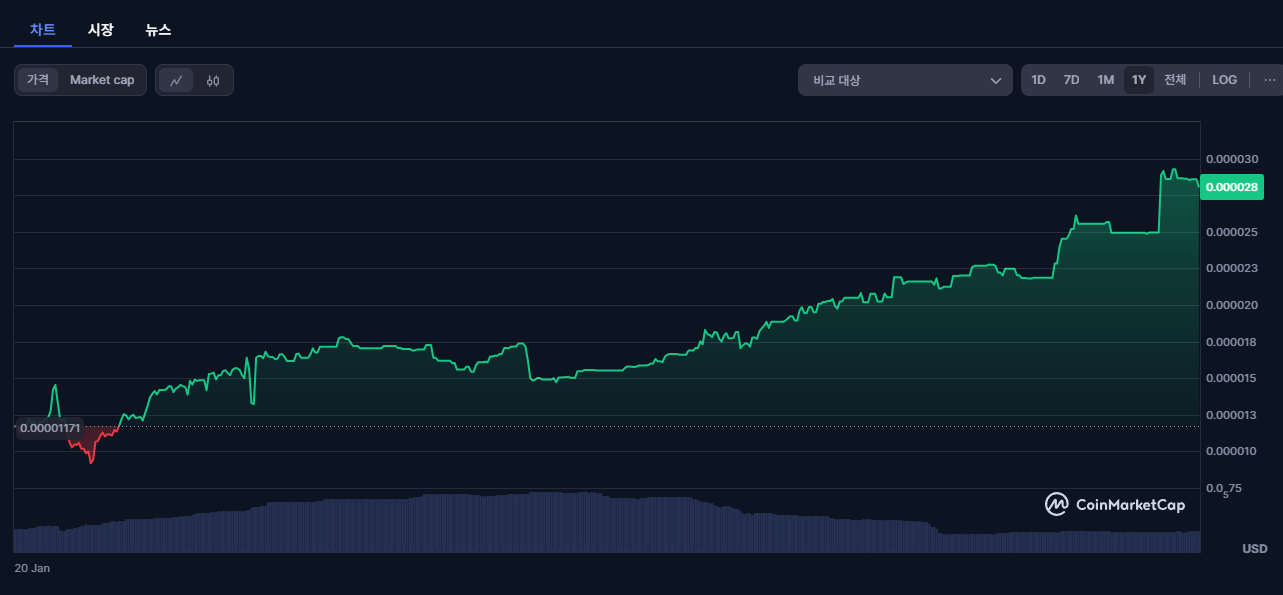 현재 재코인(jaecoin)은 현재(2025년 1월 23일)기준으로 0.00002859달러에 거래되고 있습니다. 시가총액은 약 385.6K로 한화 약 5.5억원 정도입니다. 현재 낮은 시가총액을 기록하고 있지만, 과거에 비해 많은 구매자들로 인하여 소폭 상승한 상태입니다.